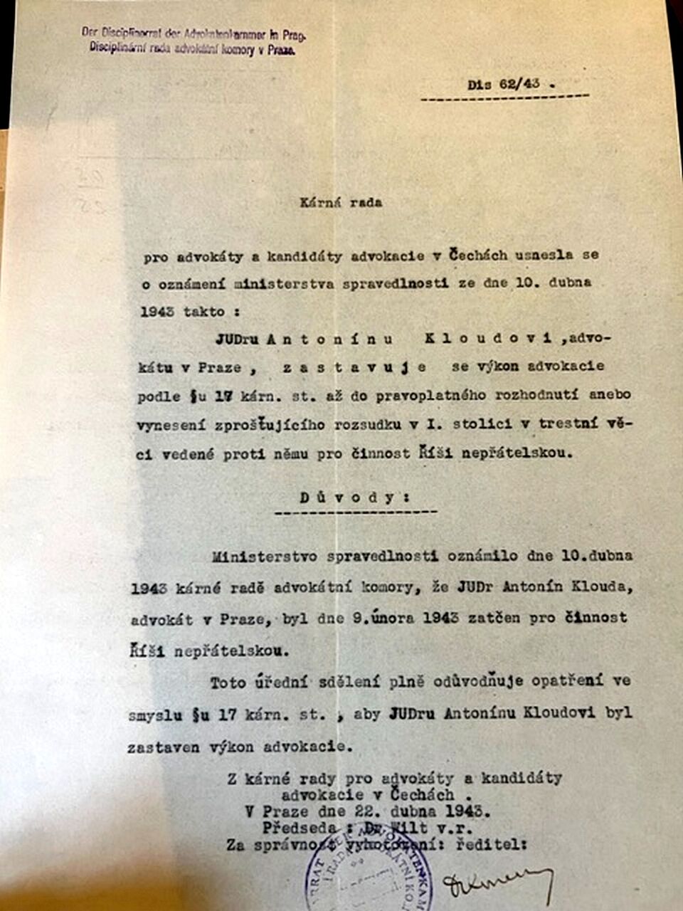 Po podpisu mnichovské dohody koncem září 1938 se však své funkce vzdal a v lednu 1939 se rozhodl vzdát se i svého členství ve Výboru Advokátní komory v Praze.