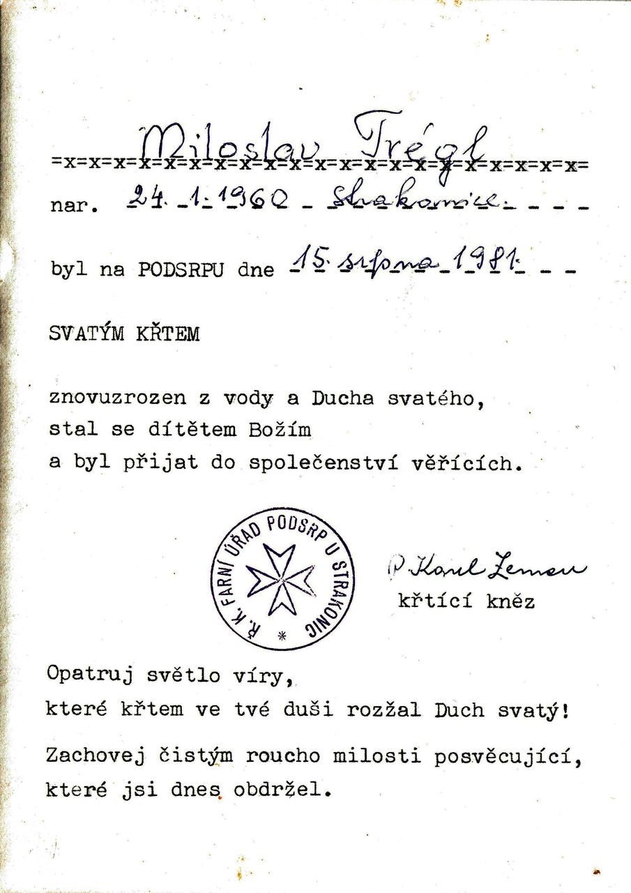 „Měl jsem starý psací stroj, tam se dalo udělat sedm kopií, zvládlo to i devět. Muselo se do toho pak ale bušit a mít ostříhané nehty,“ vypráví Miloslav Trégl, jak přepisoval INFOCHy neboli Informace o Chartě 77 a další samizdatové texty. Prostřednictvím staršího kamaráda Tondy Němejce řečeného Plíhal se dostal k horažďovickému vikářovi Milanu Píšovi. Vedle katolické věrouky se tento kněz a signatář Charty 77 věnoval i bylinkám nebo józe a hlavně vlastnil obrovskou knihovnu, ve které mladý Miloslav hledal a nacházel odpovědi na své otázky. Kolem Milana Píši fungovala pestrá společnost nepohodlných lidí z jihozápadních Čech. Svou duchovní cestu Miloslav završil v roce 1981 přijetím svátosti křtu. Tou dobou byl už vikář Píša v exilu.